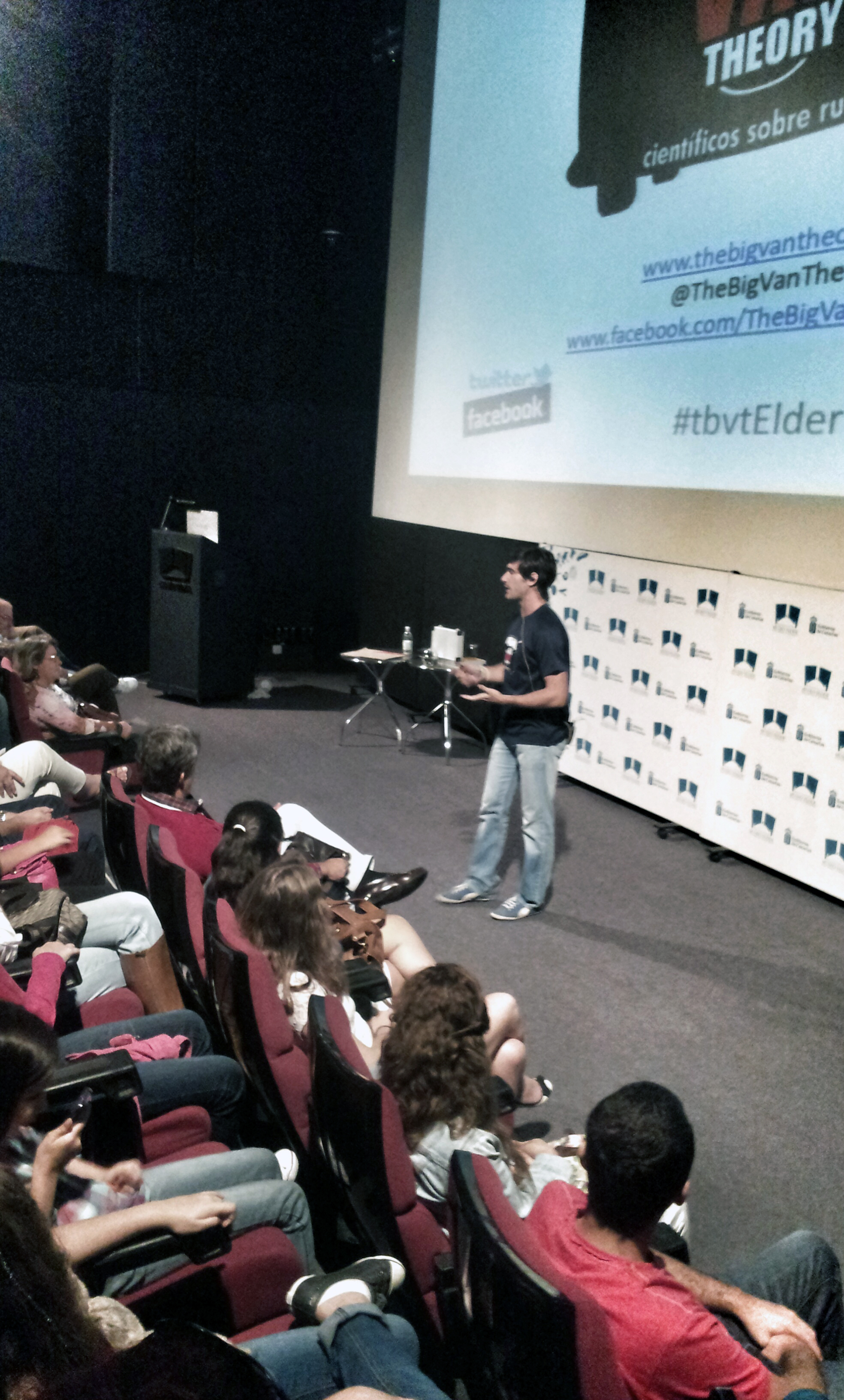 Há quatro meses no Brasil para fazer seu pós-doutorado em física de partículas na Universidade do Estado do Rio de Janeiro (Uerj), Javier Santaolalla Camino disse de cientistas que integra o espetáculo “The Big Van Theory” está completando um ano em atividade. Segundo ele, ninguém se conhecia até participar da versão espanhola do concurso FameLab, concurso criado em 2005 na Grã-Bretanha e dirigido a jovens cientistas interessados em divulgar a ciência. Durante o curso de convivência de três dias que fizeram para o evento a amizade começou e os cientistas, de áreas como física, engenharia, biologia, química e matemática, entre outras, decidiram se reunir para fazer apresentações pela Espanha depois do concurso. Surgiu então a ideia do espetáculo “The Big Van Theory”, alusão ao seriado de sucesso criado em 2007 pela rede norte-americana CBS (no Brasil, o programa é apresentado no canal pago Warner Brothers Television).
